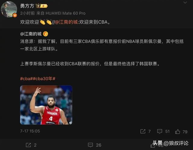 根据媒体人勇方方社交媒体向斯佩尔曼表示了欢迎,而且有消息称这位外援下个赛季将代表北京首钢男篮出战。